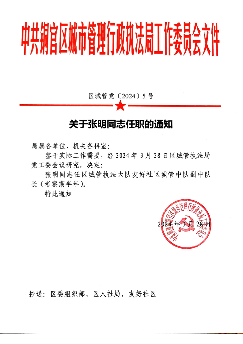关于张明同志任职的通知-铜官区人民政府