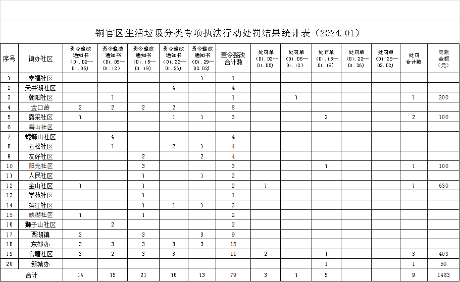 1月份,20个镇办社区城管中队在所辖区域内持续开展垃圾分类专项执法行动,共下达垃圾分类责令整改通知书79起,处罚决定书9起,罚款金额1483元。