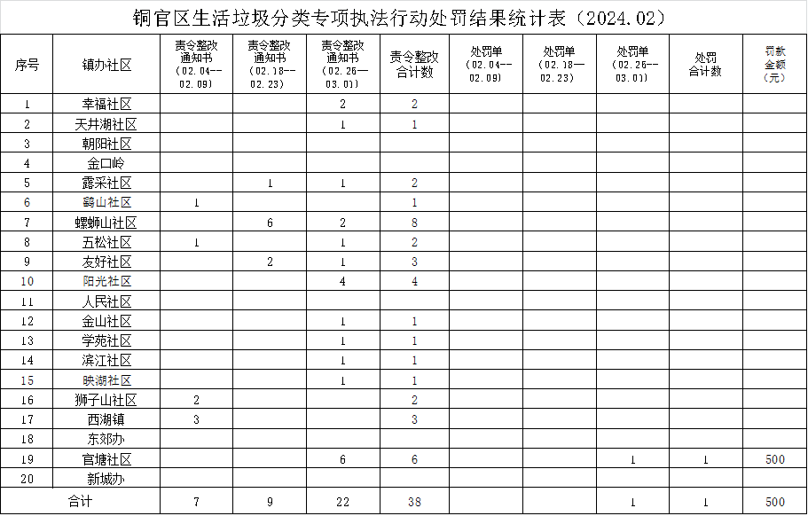 2月份,20个镇办社区城管中队在所辖区域内持续开展垃圾分类专项执法行动,共下达垃圾分类责令整改通知书38起,处罚决定书1起,罚款金额500元。