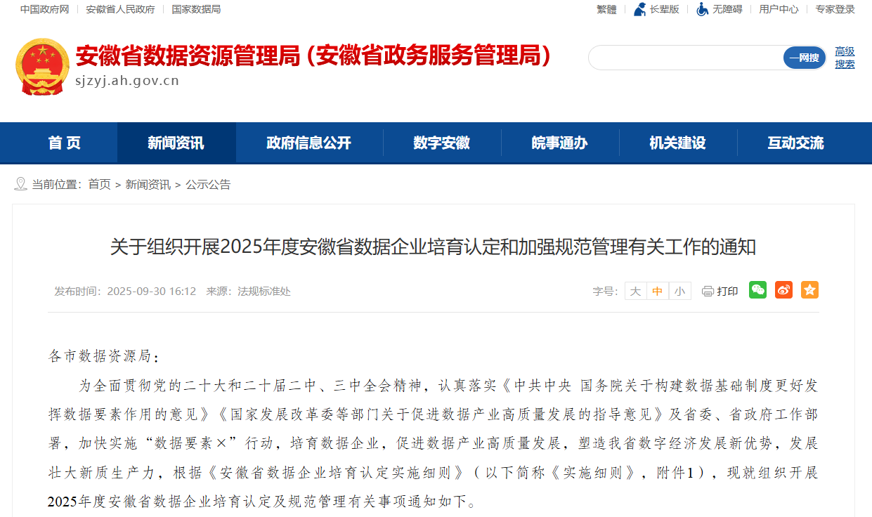 为全面贯彻党的二十大和二十届二中、三中全会精神,认真落实《中共中央 国务院关于构建数据基础制度更好发挥数据要素作用的意见》《国家发展改革委等部门关于促进数据产业高质量发展的指导意见》及省委、省政府工作部署,加快实施“数据要素×”行动,培育数据企业,促进数据产业高质量发展,塑造我省数字经济发展新优势,发展壮大新质生产力,根据《安徽省数据企业培育认定实施细则》(以下简称《实施细则》,附件1),现就组织开展2025年度安徽省数据企业培育认定及规范管理有关事项通知如下。