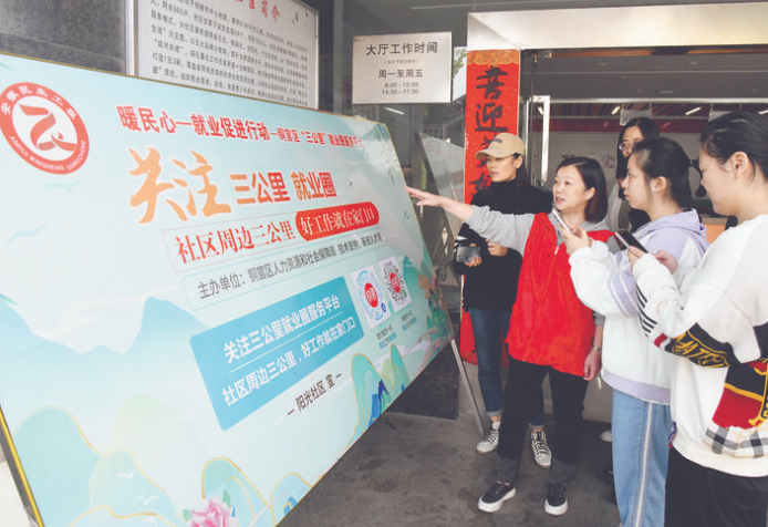 图为幸福社区工作人员在指导居民注册登录“三公里”就业圈服务平台,服务居民方便就业。