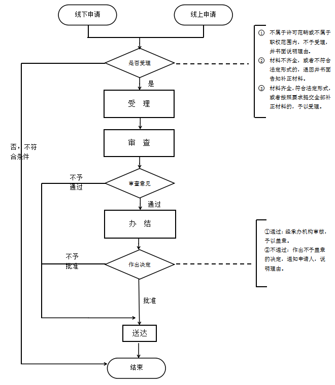 1.受理:申请人通过安徽政务服务网铜陵分厅网上申报或按规定时间提交材料,窗口受理审核材料是否符合审批要求,如符合要求发放受理通知书,如不符合要求发放不予受理通知书或当面告之,如缺少材料发放补正材料通知书或当面告之;