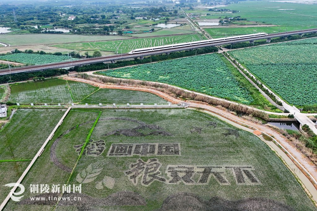 日前,一列高铁驶过铜官区西湖镇横塘乡村生态园的“稻画中国、粮安天下”主题稻田画。该生态园以黑稻、白稻为“颜料”,连续两年创作稻田画,推动农旅融合,助力乡村振兴。