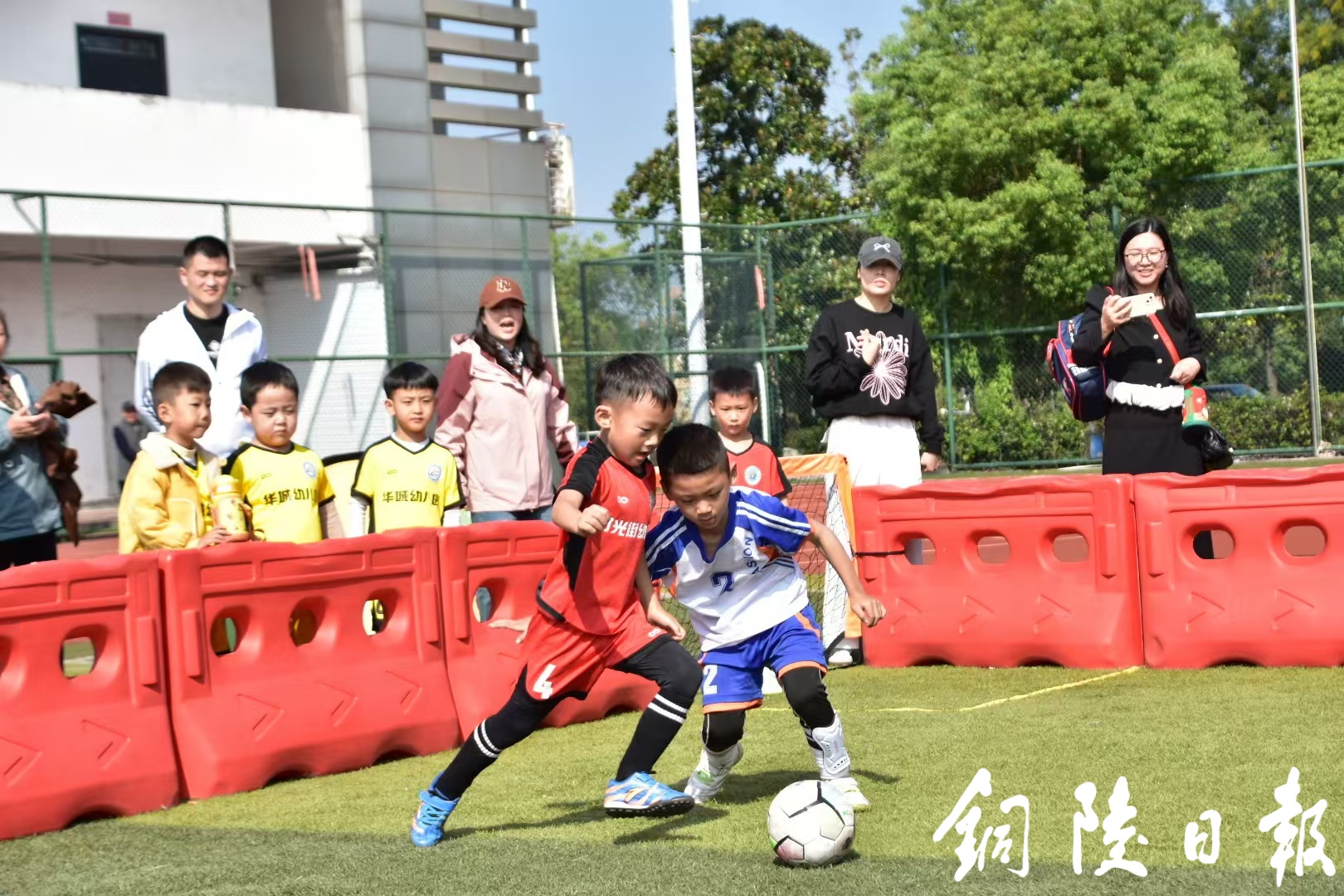 据悉,本届校园足球文化节以“阳光足球 快乐成长”为主题,由铜官区教育局和文旅体局联合主办,共有76支球队、800多名运动员参加比赛,将开展一系列丰富多彩的赛事活动。其中,小学组为五人制足球比赛,幼儿组包括勇士赛道、夺宝大挑战、最佳得分王、3V3趣味足球等趣味PK赛。