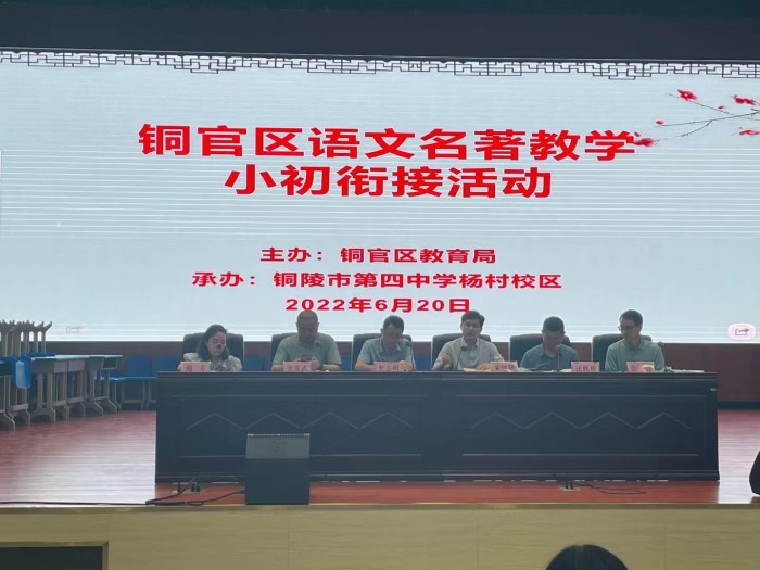 2022年6月20日下午,铜官区语文名著教学小初衔接活动在铜陵市第四中学杨村校区拉开帷幕。来自一县三区的语文同仁们共聚一堂,共同探讨小初衔接问题。