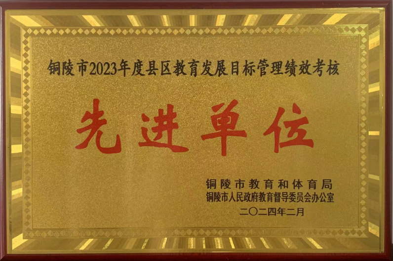 3月11日上午,全市教育高质量发展大会在市行政会议中心召开。大会对2023年度县区教育主管部门进行了表彰,铜官区教育局荣获铜陵市2023年度县区教育发展目标管理绩效考核先进单位。这是区教育局第六年荣获目标管理绩效考核先进单位称号。