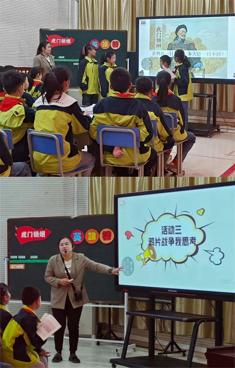 鲁老师执教五年级下册第7课《不甘屈辱 奋勇抗争——虎门销烟》。鲁老师用生动的语言和丰富的历史资料,带领学生们穿越时空,回到那个硝烟弥漫的年代。通过设计“鸦片危害我知道”“禁烟意义我知晓”“鸦片战争我思考”“香港回归我自豪”等活动环节,让学生在小组活动中回顾历史,明白“落后就要挨打”,少年强则中国强,祖国复兴的重任在同学们的肩上。
