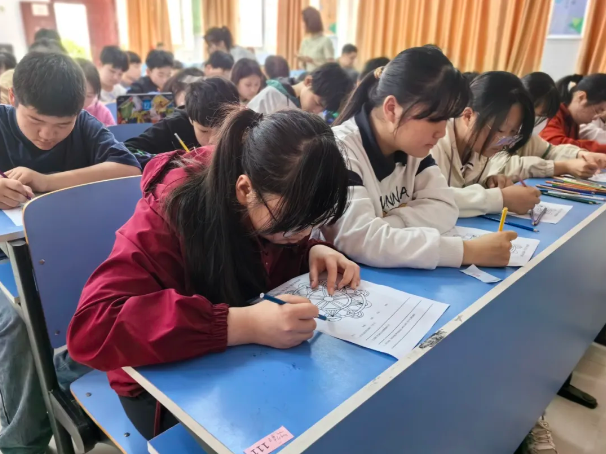 本次公益讲堂的主讲老师分别是人民小学英语教师贾丹和人民小学心理健康教师孙琼莉。根据参加活动的老洲中心学校初二初三的孩子特点,贾老师和孙老师做了精心的准备。贾老师从自己的成长经历和求学经历谈起,结合国外的任教经历,教给了孩子们轻松学习英语的小妙招。孙老师深挖孩子们内心深处的善良和美好,用一节曼陀罗自我疗愈的绘画心理课,把最美的笑容传染给了每个孩子。孩子们在两堂公益课上,不断地收获体验,收获快乐,收获成长。