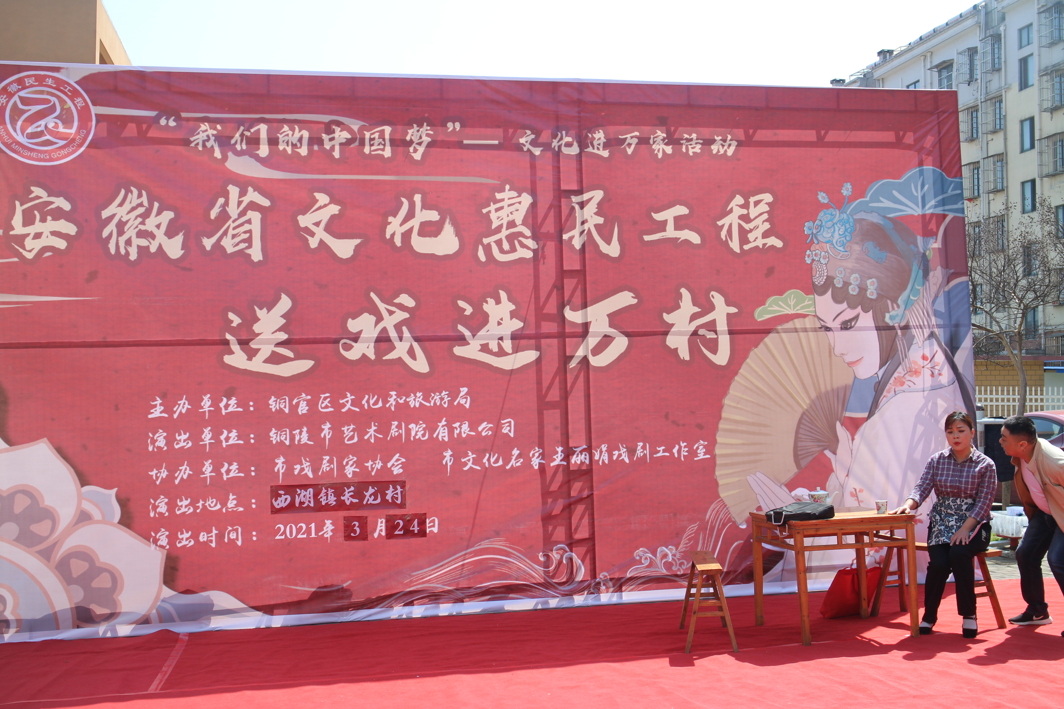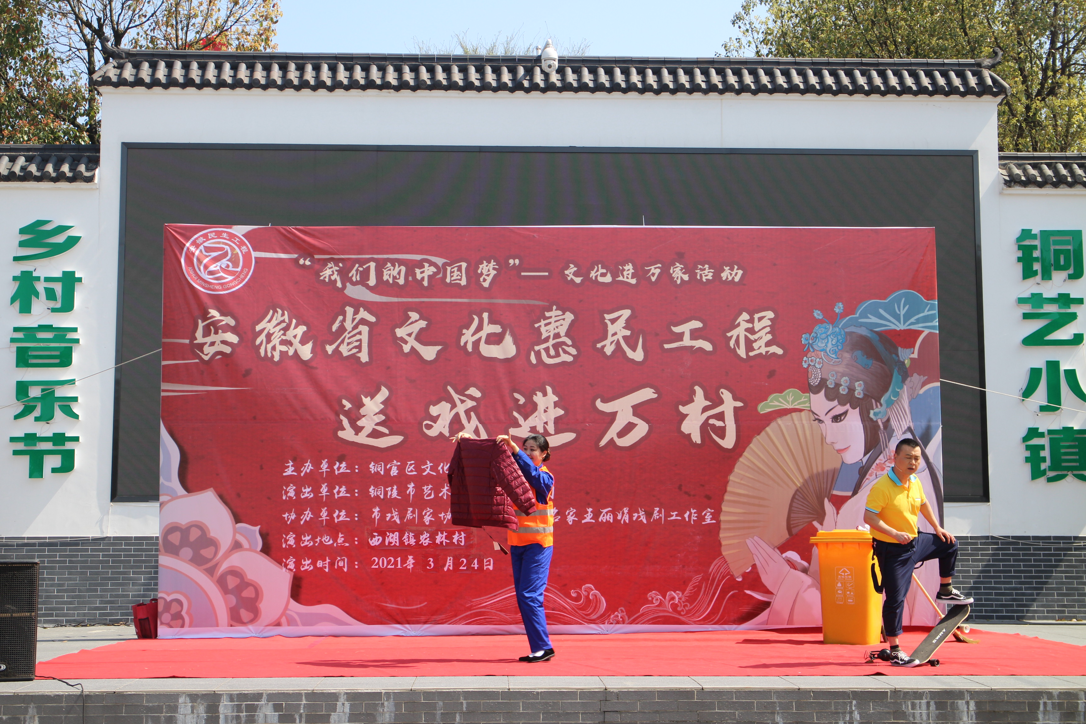 【铜官区文化惠民工程实施图集】图为“送戏进万村”西湖镇农林村活动现场演出团体表演黄梅小戏《审夹克》