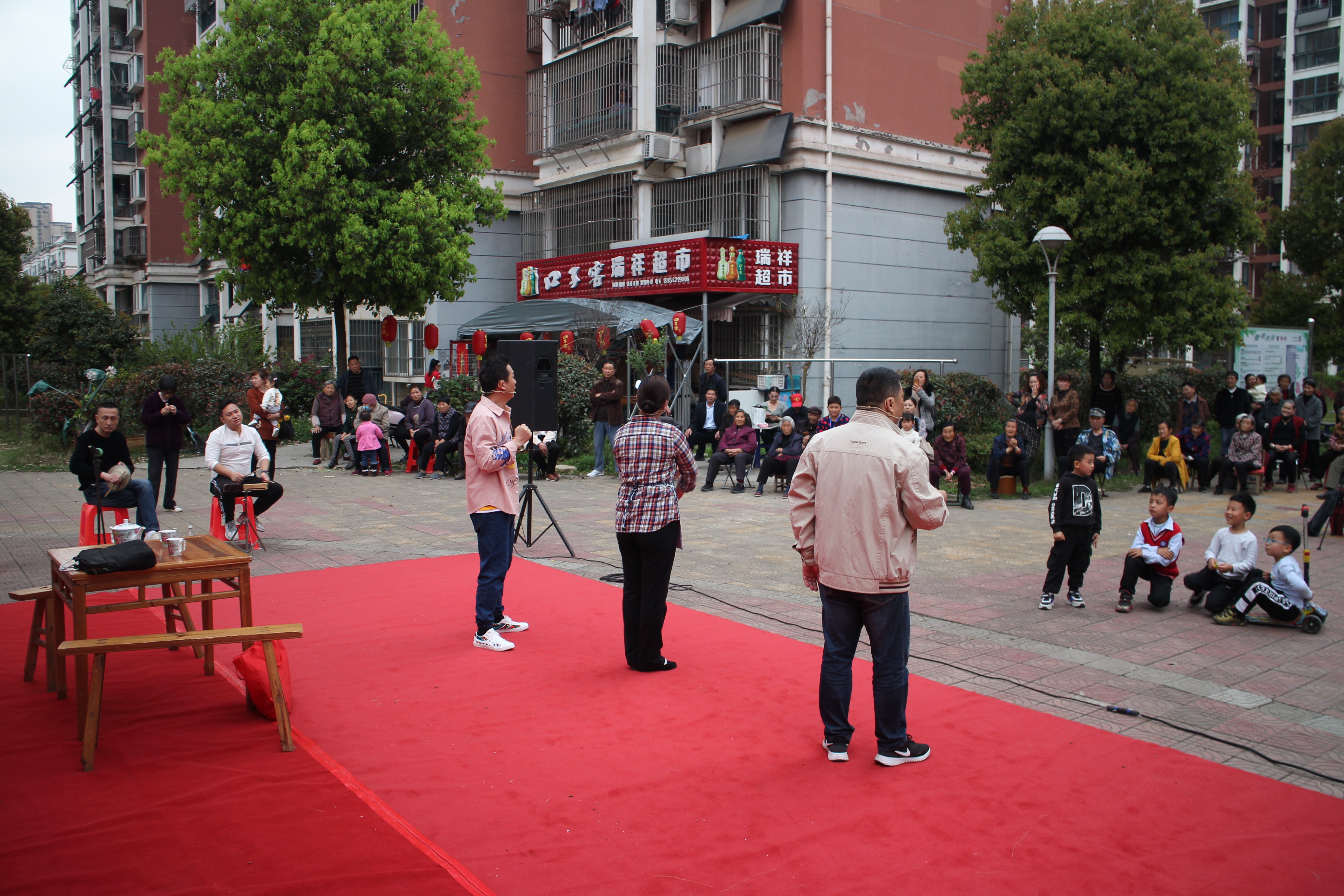 【铜官区文化惠民工程实施图集】图为“送戏进万村”西湖镇跃进村活动现场演出团体表演黄梅小戏《我家的故事》