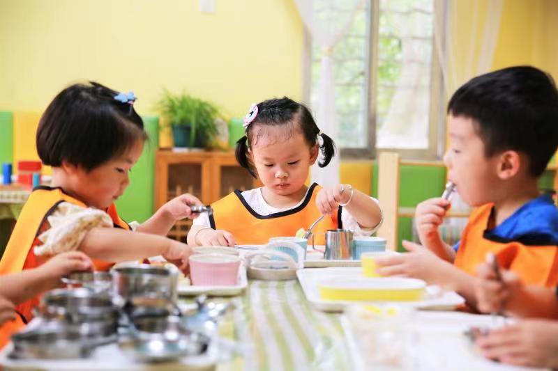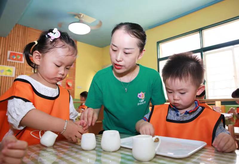【幼儿托育】图为大风车托育中心小朋友正在进行倒水动作,强化手指和手腕力量,训练手眼协调能力
