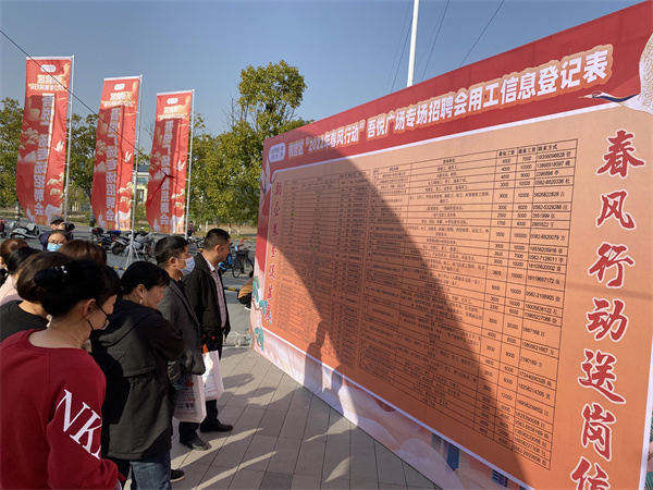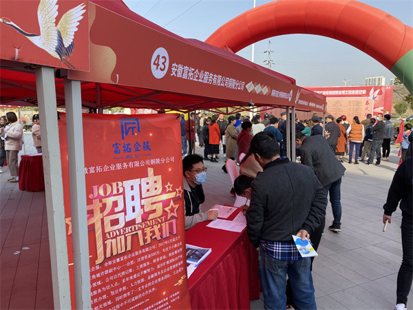 【就业促进民生实事】图为铜官区人社局联合区委非公工委、西湖镇、区总工会在吾悦广场室外广场举办铜官区2022年“春风行动”专场招聘会