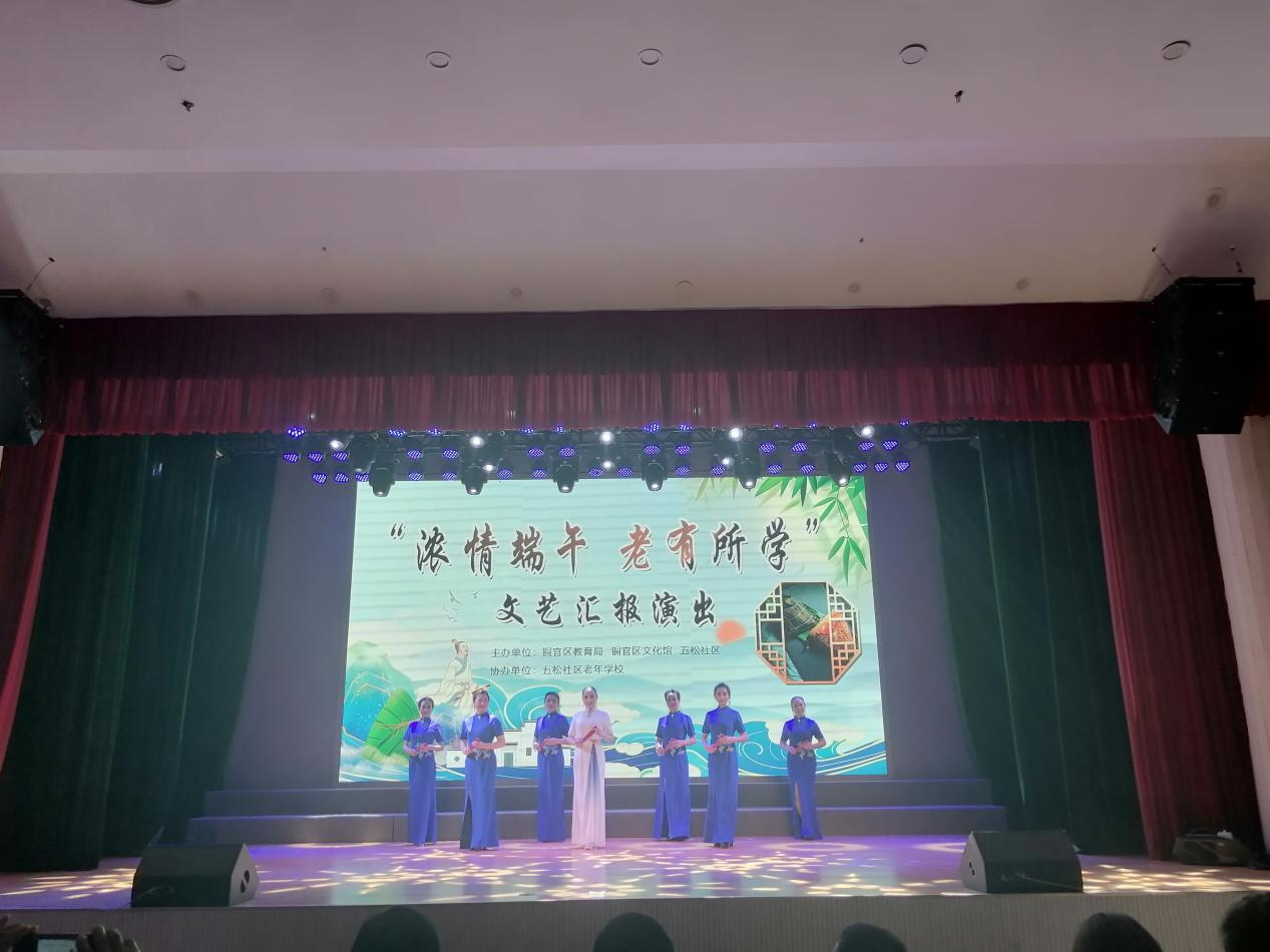 6月21日下午,区教育局、区文化馆联合五松社区在区文化馆礼堂举办“浓情端午.老有所学”文艺汇报演出,共计百余人参与。本次文艺汇演共有14个节目,旗袍折扇舞《最美中国》、黄梅戏《到底人间欢乐多》、葫芦丝《映山红》、舞蹈《今夜无眠》、歌曲《爱在天地间》等内容丰富、精彩纷呈,学员们在舞台上尽展所学,赢得现场观众们一阵阵掌声和叫好声。