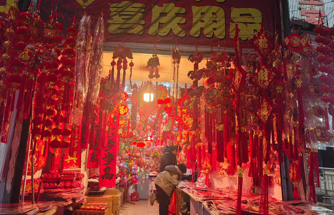 春节临近,铜官区年货市场购销两旺、暖意融融。步行街喜庆用品店内,红灯笼、中国结、春联福字等饰品挂满货架,满目中国红将新春氛围拉满,商户忙着整理货品;大型商超里,年货礼盒、生肖挂饰等商品码放整齐,市民带着孩子挑选福字挂饰,精心置办年货,一派热闹烟火气。