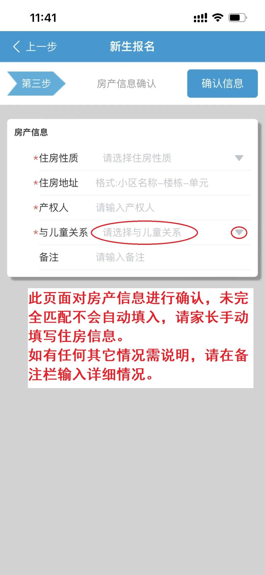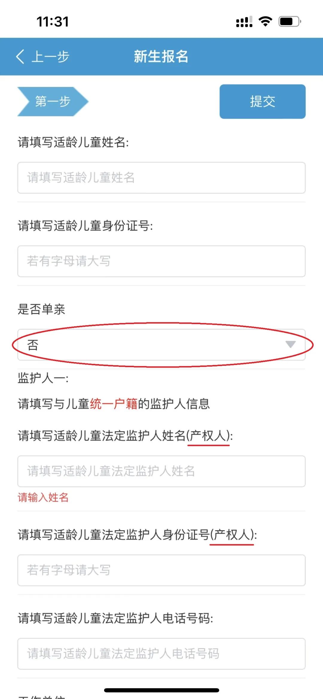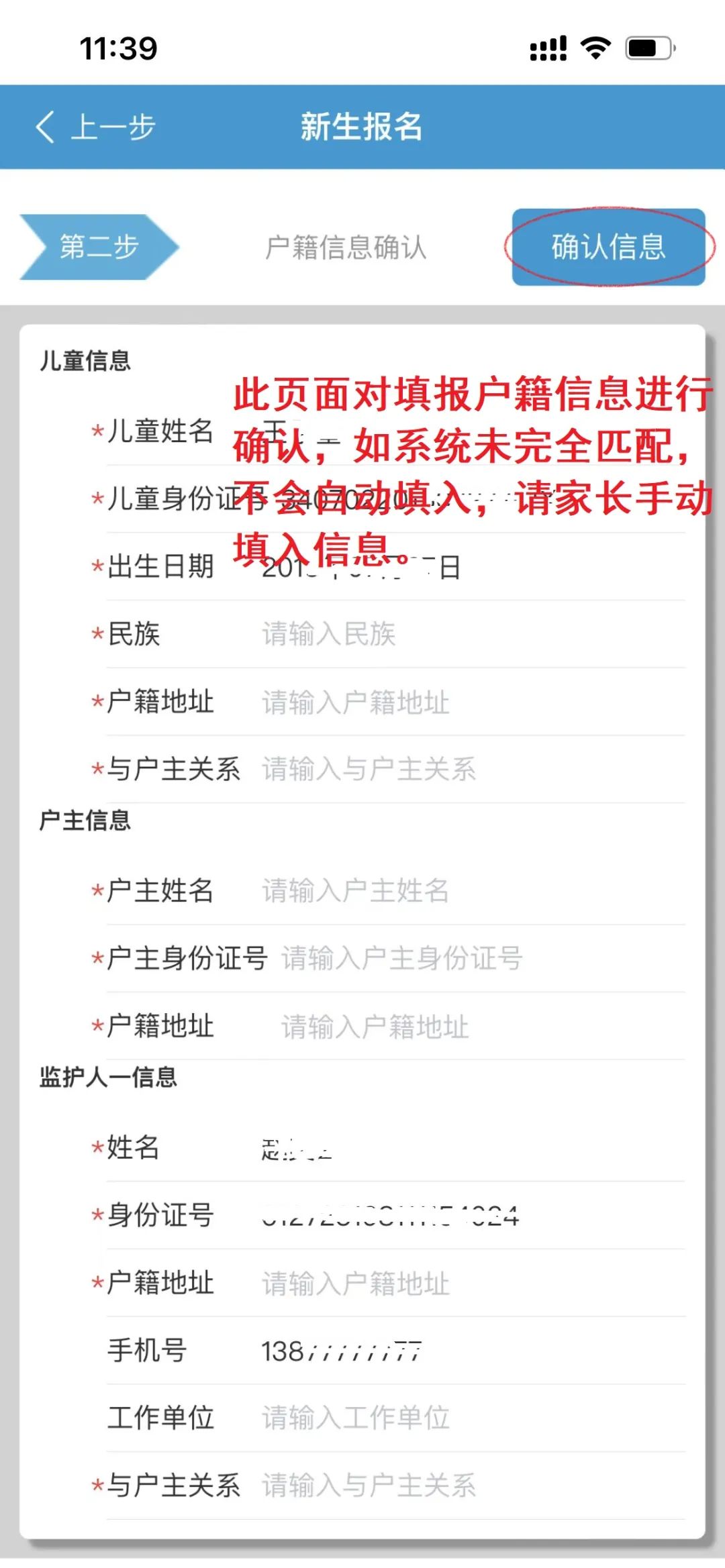 ①【基本信息】:“适龄儿童姓名”必须与户口本一致,监护人一需填写与儿童统一户籍的监护人信息。