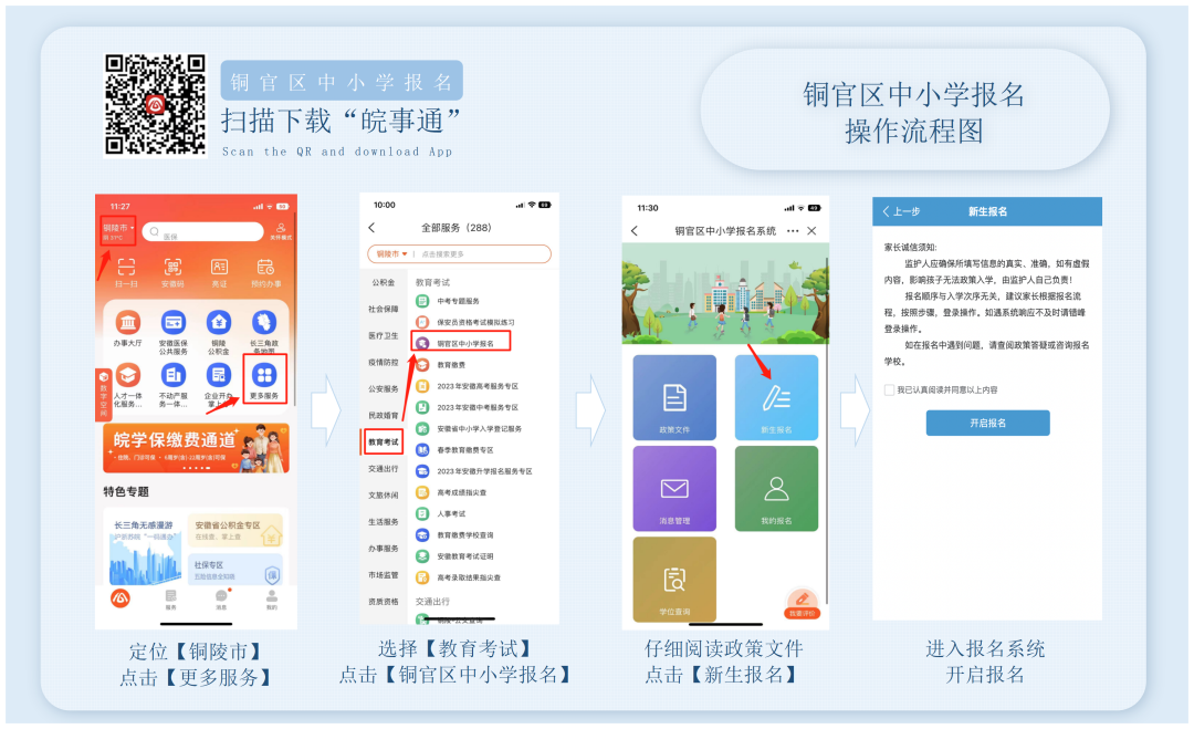手机打开皖事通-定位铜陵市-点击“更多服务”-选择“教育考试”-点击“铜官区中小学报名”-点击“新生报名”,进入招生报名系统。